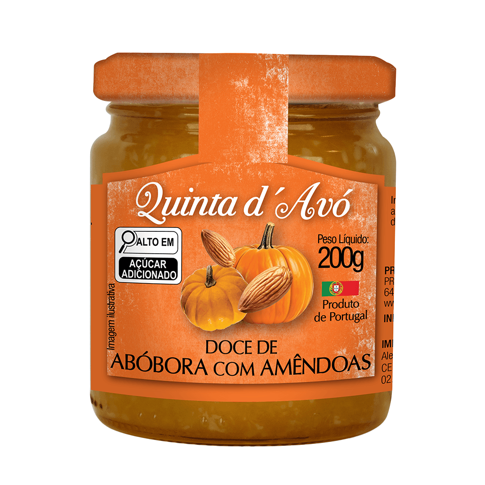 Ingredientes: Abóbora, açúcar, amêndoas, casca de laranja, canela em pau e conservante sorbato de potássio.